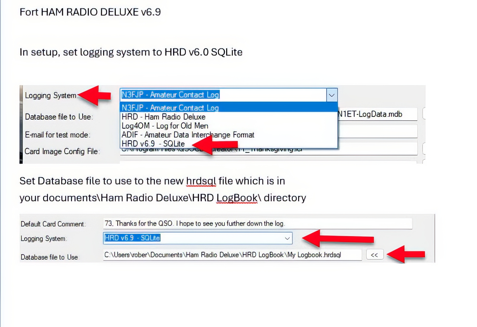 Please be aware there are two different versions of HRD, one prior to HRD 6.9 which used an Microsoft Access Database for the logbook, and the latest which uses SQLite for logging. Be sure to pick the version you are using on QSOCardCreator setup for Logging System, and point to the correst database (Access has a .MDB file extension, while SQLite has a .hrdsql extension).