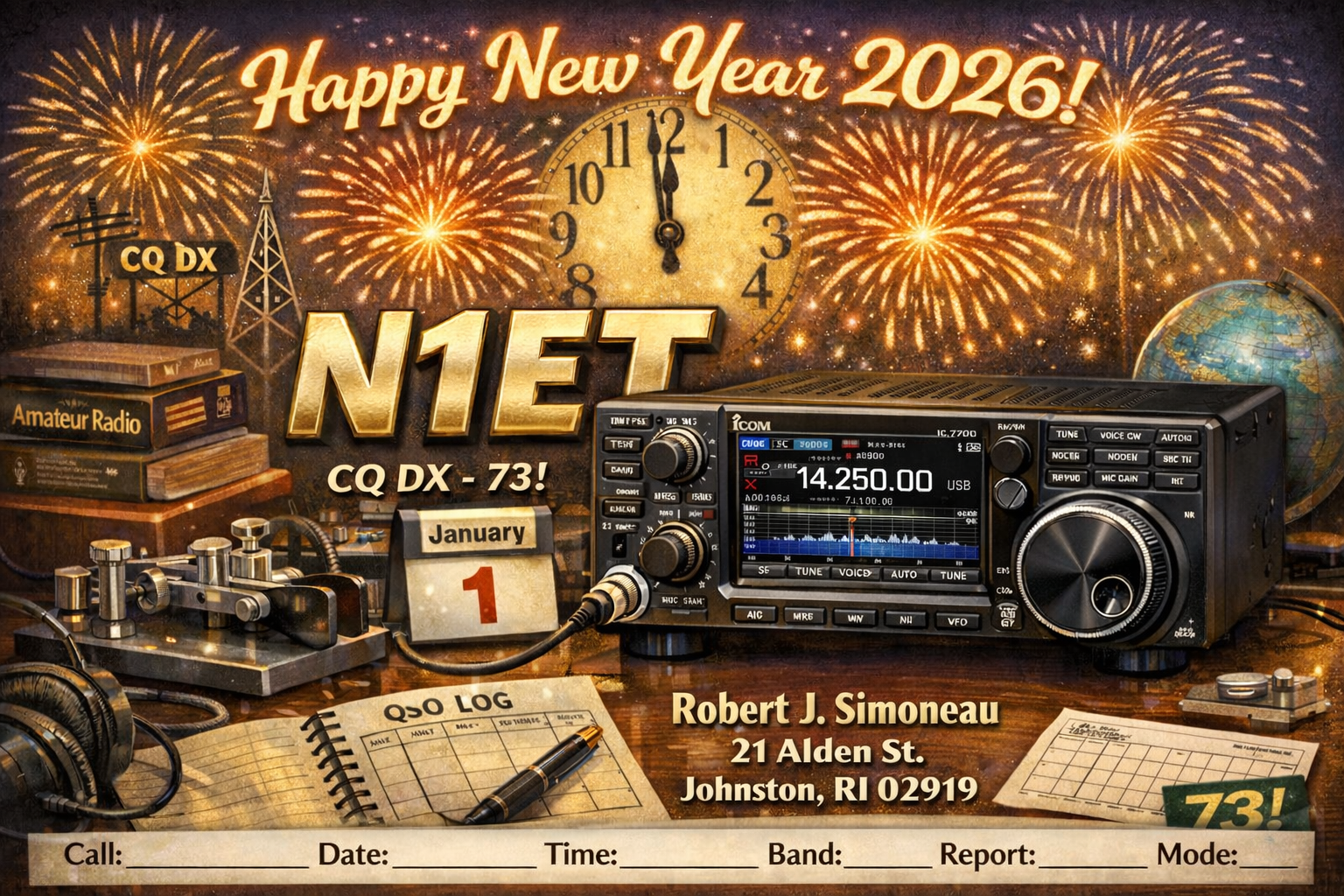 Can you help me make a QSL New Years card using N1ET as my callsign and personal info of Robert J. Simoneau, 21 Alden St, Johnston, RI 02919. I would like a ic-7300 radio used, and for it to be Ham-radio themed, no pets, 1800pxx1200px 300 dpi, and I only need the front Image created. make it for 2026 and leave space on the bottom for the contact data such as Call, Date, time, Band, Report, and mode to be filled in.